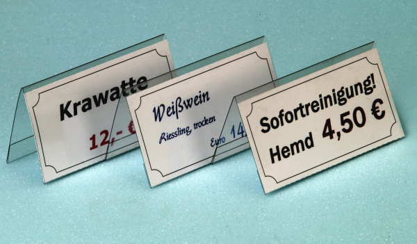 Aufsteller zur Preis- und Produktauszeichnung, fürInformationen, als Tischaufsteller für Messeexponate, für Rezeptionen als Tischnamensschildund vieles mehr.